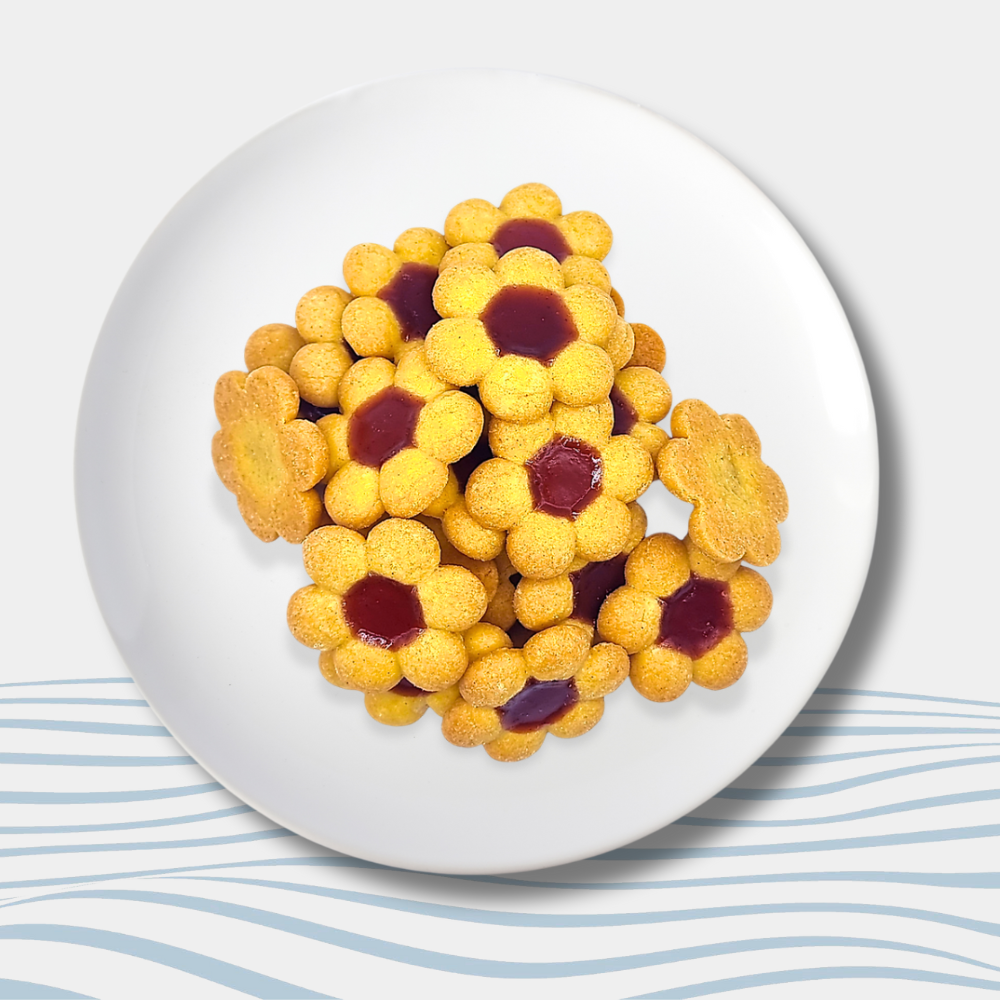 Unsere Butterblüte Johannisbeere vereint das Beste aus zwei Welten: die zarte Buttertextur eines klassischen Gebäcks und die frische, fruchtige Note der Johannisbeere. Hergestellt aus feinstem Weizenmehl, hochwertiger Butter und fruchtiger Johannisbeer-Konfitüre, begeistert diese Butterblüte mit einer einzigartigen Balance aus Süße und Frische.